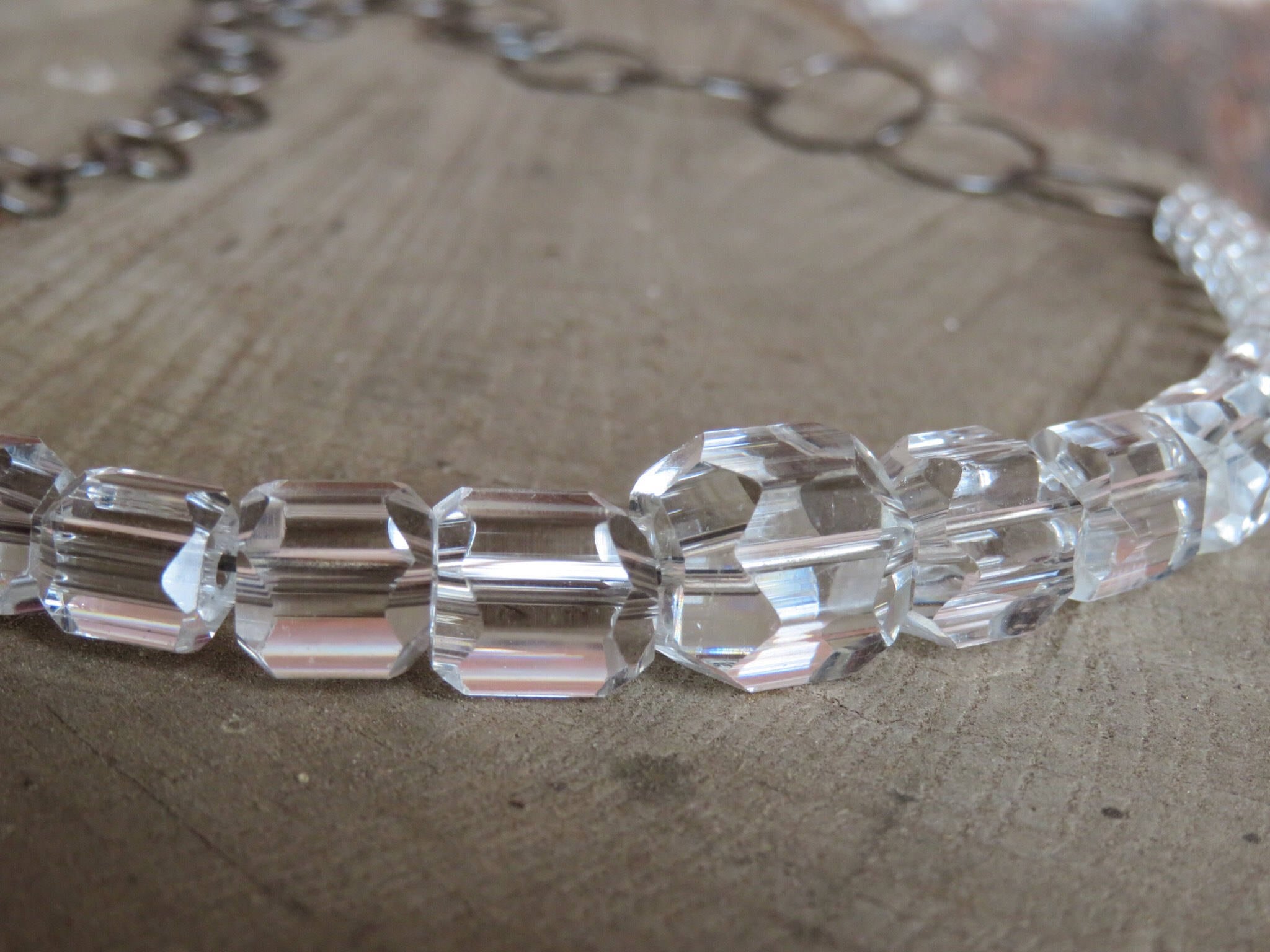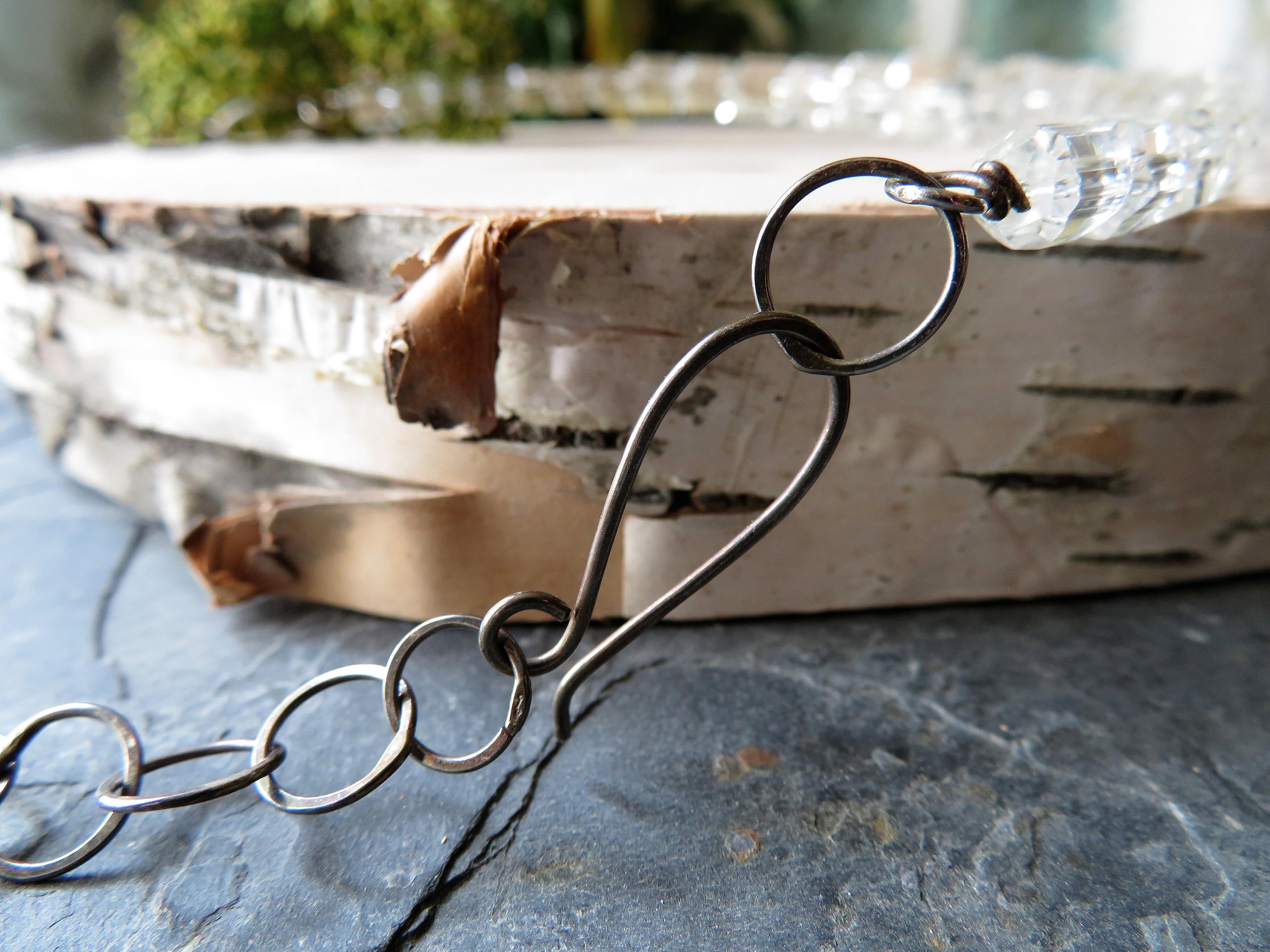 Being a fan of both asymmetry and contrast, I decided to go organic with a hand-forged and hammered chain of round oxidized sterling links, roughly graduated from one side to the other, and finishing with a long, curvaceous hook that fastens at the taller side of the crystal collar. I couldn't be happier with the result, and I hope you are, too.