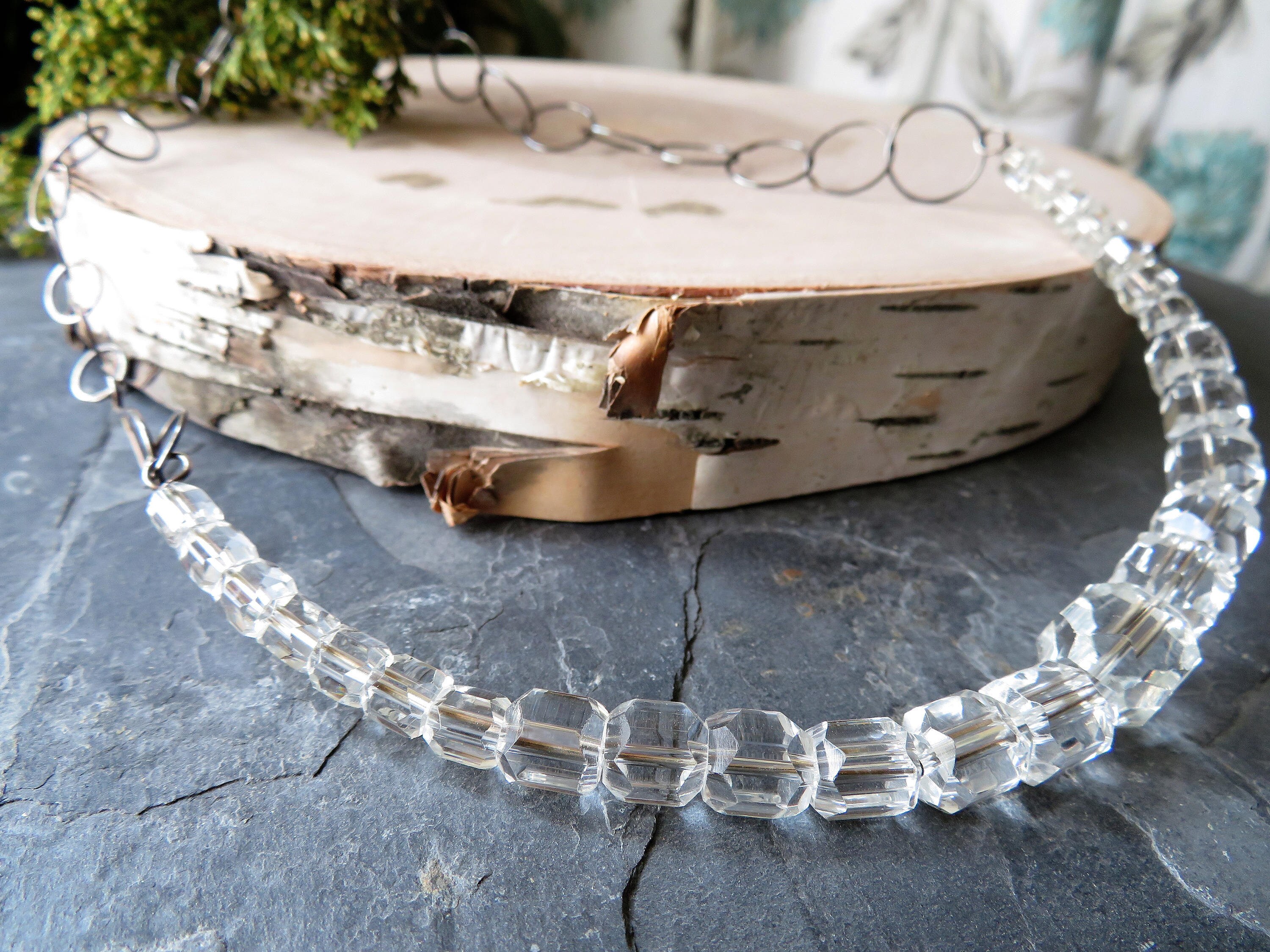 The twenty-six faceted crystals range in size from 1/4 to 1/2 inch. The curve of crystals measures about 5 and 1/4 inches wide by 2 and 1/2 inches tall, with the total circumference of the necklace measuring approximately 20 inches.